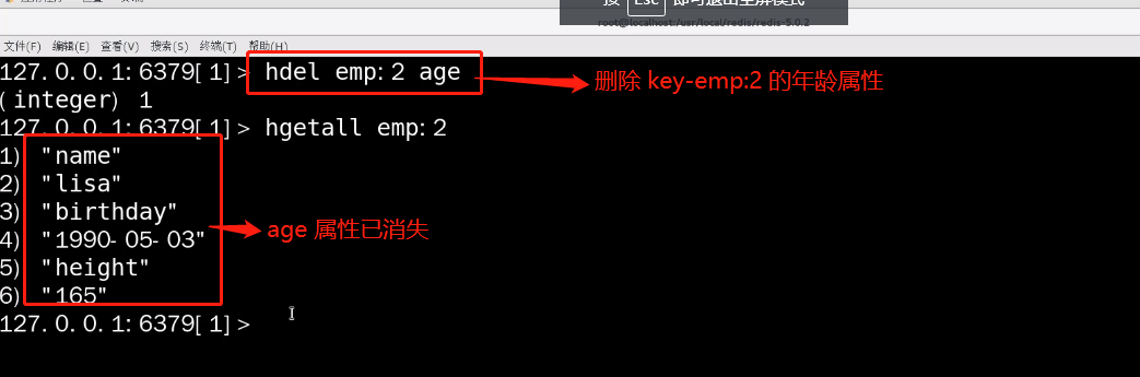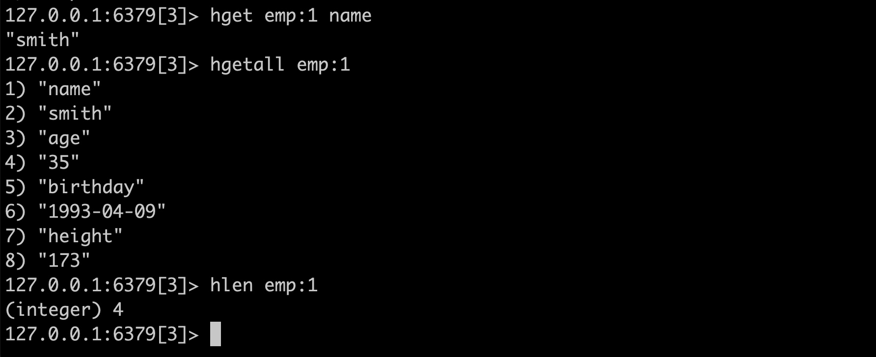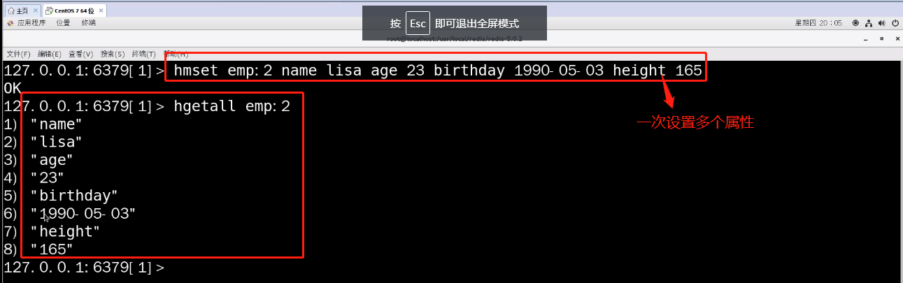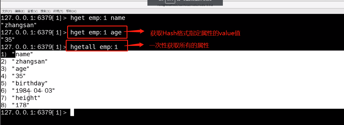 格式:2,获取所有属性 hgetall key (奇数行为属性名,偶数行为属性值,)