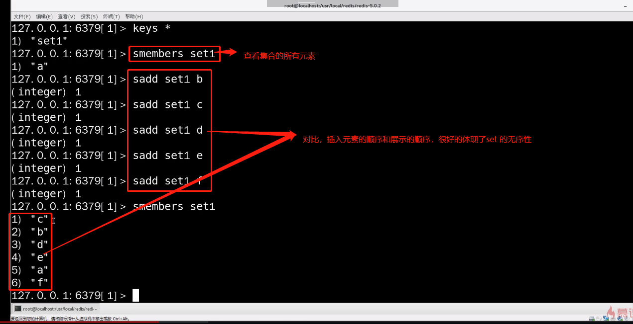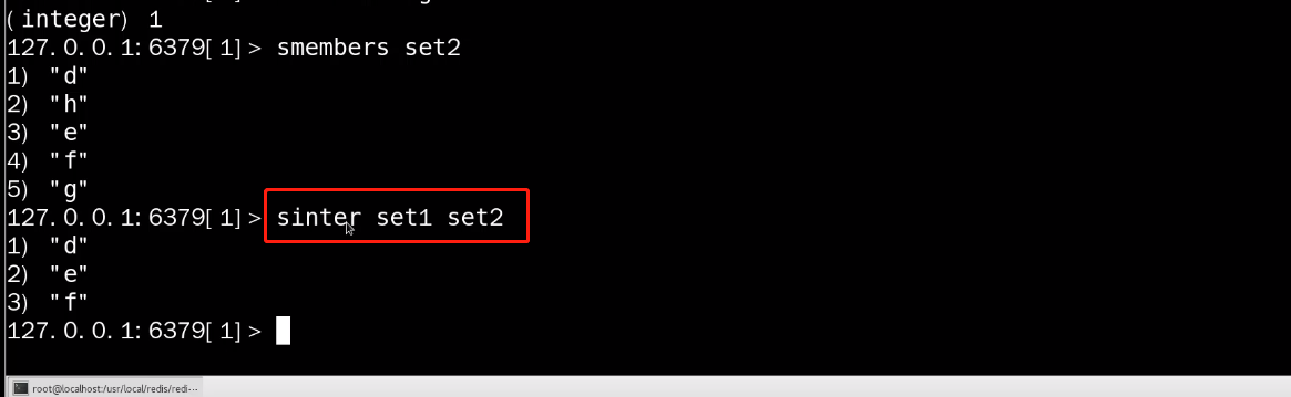sdiff--差集 set1 set2(差集的使用是有前后顺序的,表示前面集合中有,而后面集合中没有的元素)