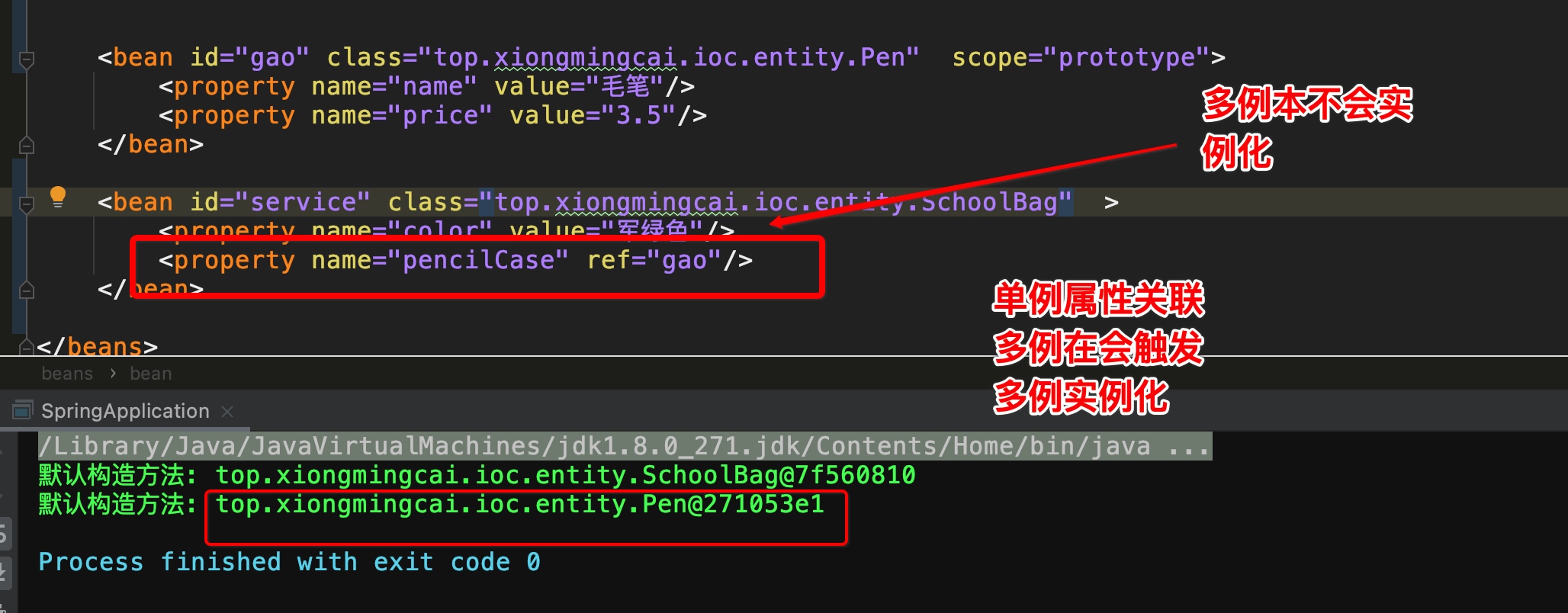 多例模式下,在 bean 的获取时,才会创建对象。