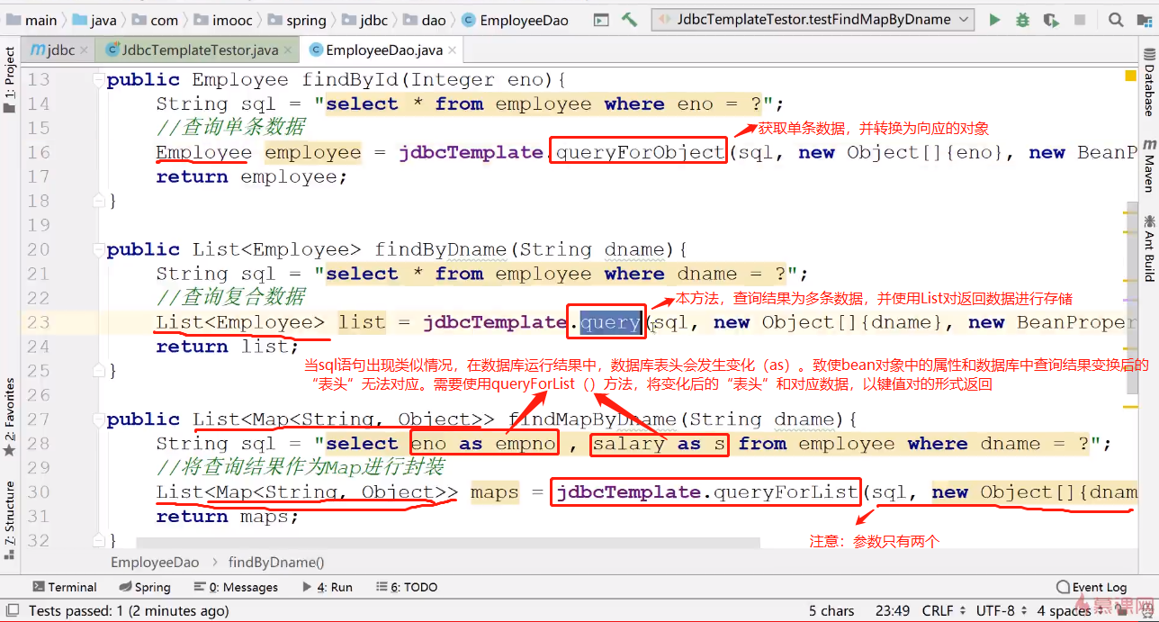 实体类与数据库中每条数据的字段保持驼峰命名,而Dao类则是要包含JdbcTemplate对象从而对数据源进行操作,操作时直接调用jdbcTemplate封装好的一系列方法即可。