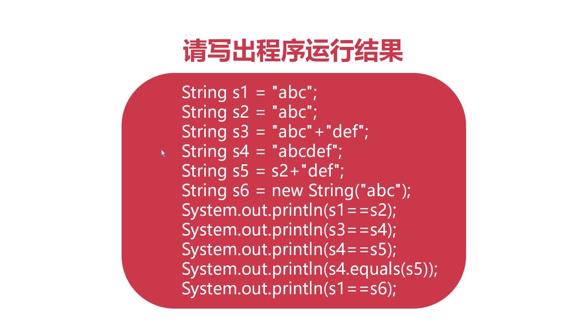 String s1 = "abc";是在程序启动时生成,存放在常量池中。s6是运行时创建的,字符串对象是不会在常量池中保存。所以对比起索引值的结果为false;