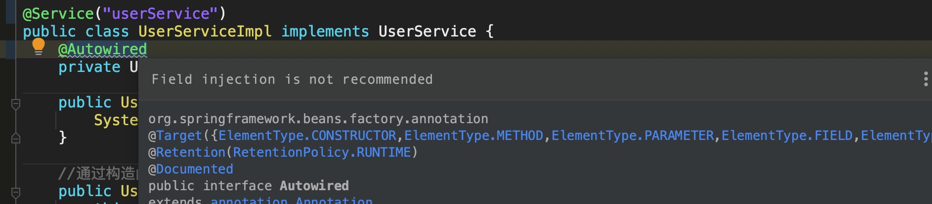 对于构造函数注入来说实际开发中并不推荐使用,因为使用构造函数注入UserDao 和UserService 出现紧密耦合,