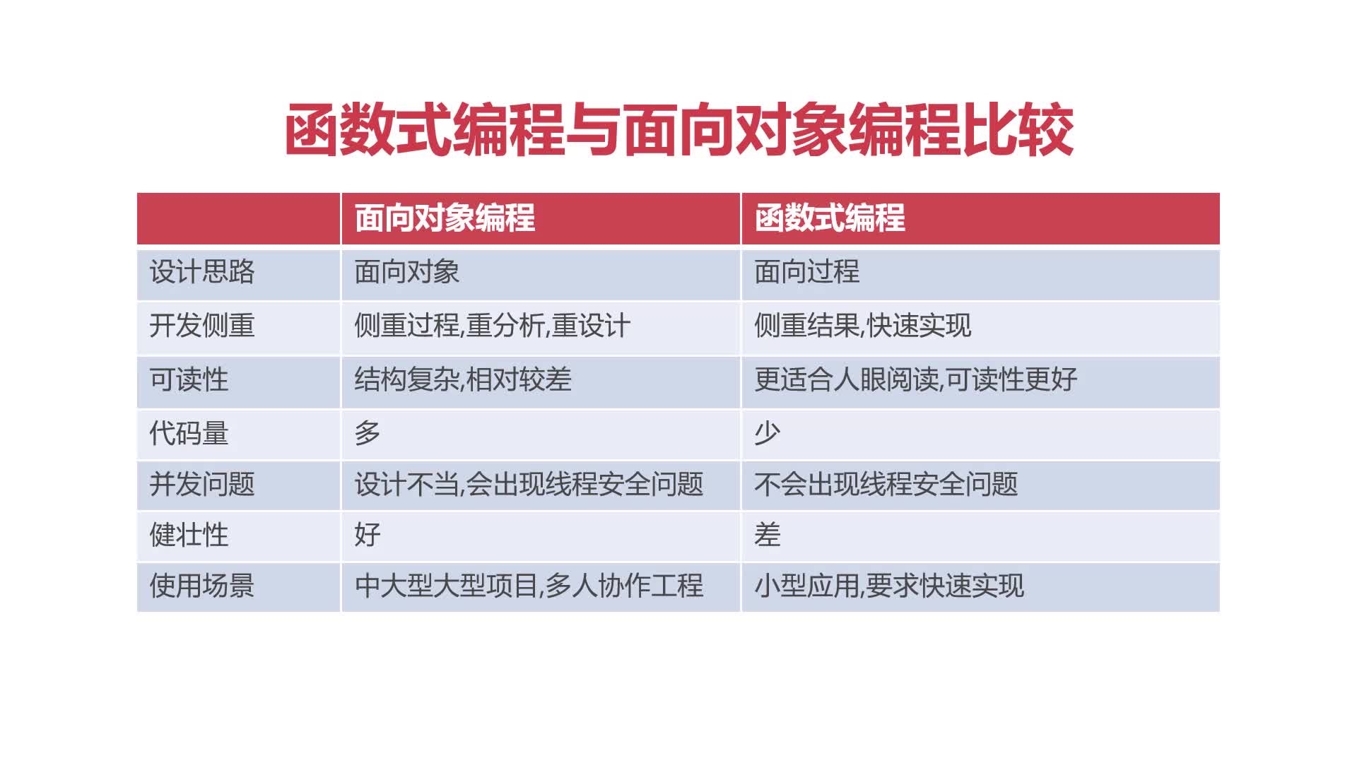 如果你开发的是一个需要多人协作的比较大的应用项目的话,那么还是采用面向对象编程的方式。如果你在开发一些小型应用的时候,比如写一些系统运维的程序或者一些简单的计算代码,那么这个时候就可以使用函数式编程来快速实现它,可以帮助我们节省不少的代码一样。