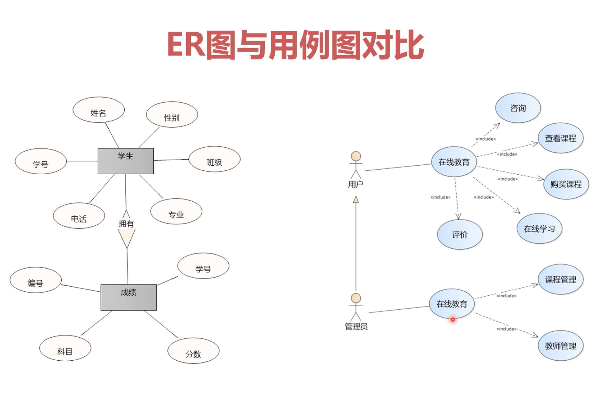 右侧用例图表现的是用户和功能之间的关系,比如说有一个在线教育的系统,那么普通用户能在这个系统上去咨询课程,查看课程,购买课程、在线学习,还有对课程进行评价,这些都是普通用户所具有的功能。还有一个从普通用户派生出来的一个新的角色叫做管理员,那么这种用户他在使用在线教育系统的时候,从普通用户这里继承了很多的功能,接下来管理员的用户所具备的独有的功能,咱们来看一下在用例图里边单独画了一下,就是拥有课程管理,还有教师管理这些功能。所以一看到用力图我们就明白将来我们要开发的在线教育系统有什么样的功能,那么哪些角色哪些用户能使用这个系统里边的什么功能,在用例图里边表现得一清二楚。
