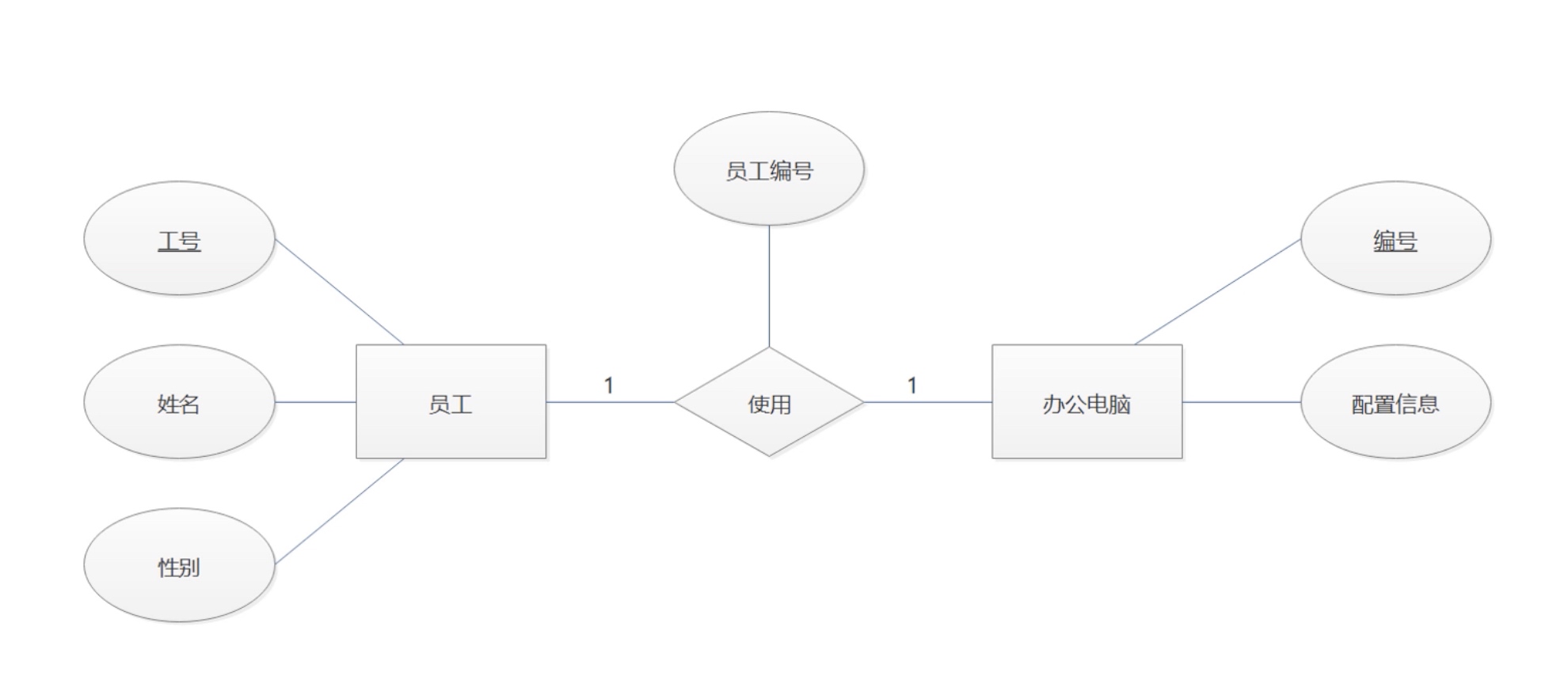 员工和办公电脑之间就应该是一对一的关系,为了表现出这种一对一的关系,我们在两个实体之间连上了一个菱形,因为员工可以使用电脑,所以菱形里边的文字就为使用,菱形的两侧分别选上了数字一,那么就代表说员工和办公电脑这两个实体是一对一的一个映射关系。菱形的上方就是实体之间的关联属性,在创建数据表时,员工表和办公电脑表通过 员工编号相关联。