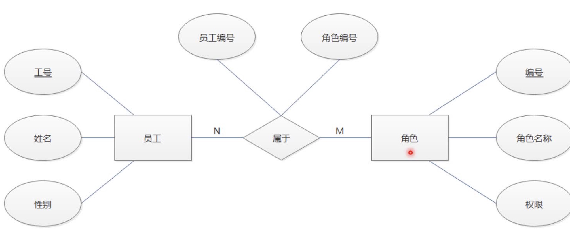 图里边定义了员工和角色两个实体,那么一个员工可以对应多个角色,一个角色也可以对应多个员工,因此说两个实体之间就是多对多的关系。在这里面我还是用菱形连接了两个实体,一边写上字母n另外一边写上了字母m这就代表多对多的关系了。