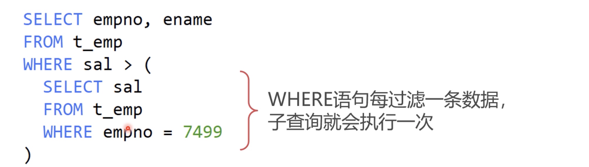 每次筛选一条员工记录的时候,那么就会执行一次子查询,如果说我们的员工表里边有1万条数据,那么子查询就要执行1万遍。如果说员工表里面有10万条数据,这个子查询就要实行10万遍,这真是太恐怖了,所以查询的效率太低,我们真得注意了,不能这么去写SQL语句,那么有什么办法可以解决这个问题?