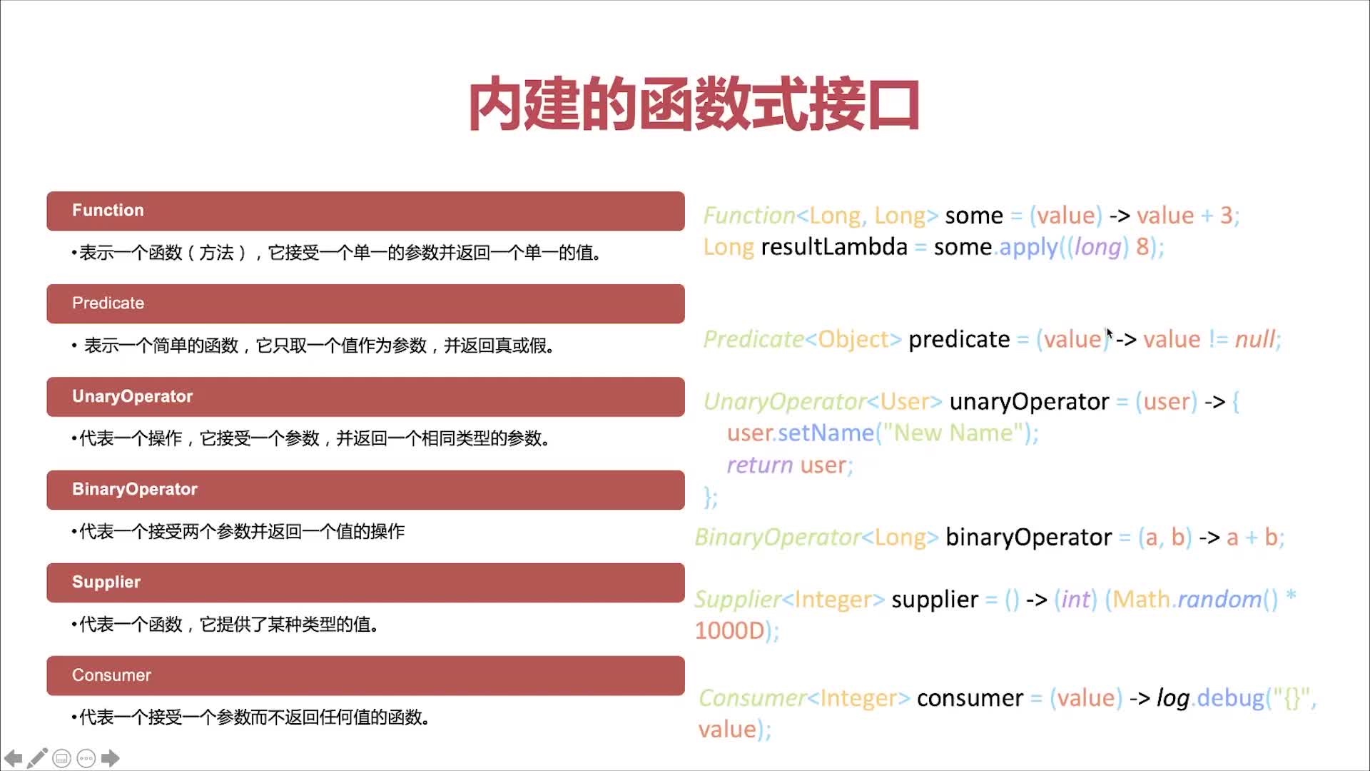 Comparator接口,或者Runnable接口。对这些现成的接口进行实现,可以通过@FunctionalInterface标注来启用Lambda功能支持。 - 此外,Java 8 API 还提供了很多新的函数式接口,来降低程序员的工作负担。
