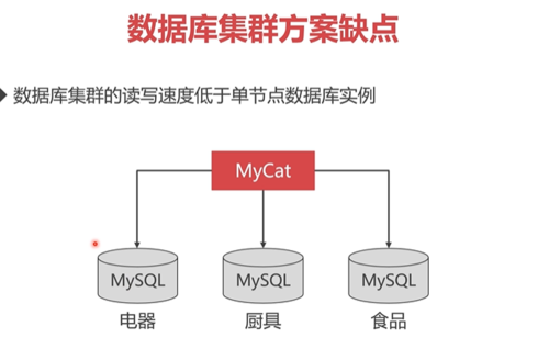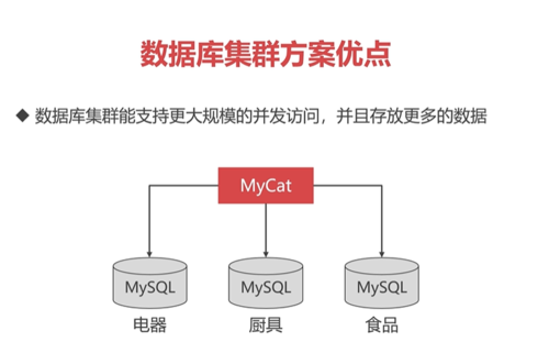 比如说我把电器数据存放在第一个MySQL上面,厨具的数据存放在第二个MySQL,食品数据存放在第三个MySQL节点,那么数据经过切分存放之后,集群能保存的数据量也就更多了,而且我们在给MySQL节点配上冗余的备份节点,比如说第一个MySQL节点挂掉了,那么它的备份节点就可以立即投入使用,这样抵御故障的能力也比单节点MySQL好很多。以上就是我们为什么要使用数据库集群的原因了。