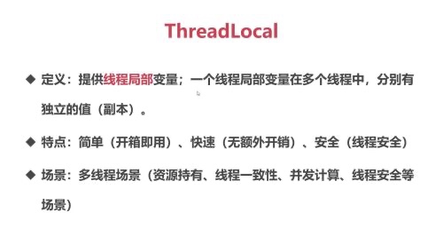 一个进程多个线程是如今操作系统层面的规范,如果一个进程中的所有的线程他们在同步计算结果的时候,去访问进程中的一个存储变量,那就会产生竞争条件,我们之后会讲到这里有一致性问题需要上锁,而线程局部变量,也就是ThreadLocal它能够避免这种场景的发生,因为一个线程局部变量在多个线程中它可以拥有独立的职能,独立的副本,相当于给每一个线程分配了一段独立的存储空间,他们不用产生冲突。